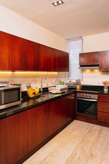 El departamento tiene excelentes acabados, pisos de mármol, muros con acabado Chukum y está completamente equipado. Consta de 3 recámaras, 3 baños completos con cubierta de mármol en los lavabos, canceles de baño de cristal templado. Clósets de madera, climas, ventiladores en toda la propiedad. Sala /estancia, comedor, lavandería, calentador de agua eléctrico y cocina integral con acabados de lujo. La cocina está equipada con estufa eléctrica, horno y refrigerador. Cuenta con balcón en la recámara principal y terraza con jacuzzi. Tiene un cajón de estacionamiento.
