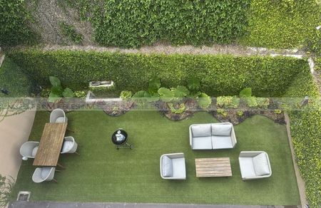 Área social con muebles empotrados en maderas finas y bufetero con cubierta en cuarzo, integrada a un jardín de aproximadamente 50m2.