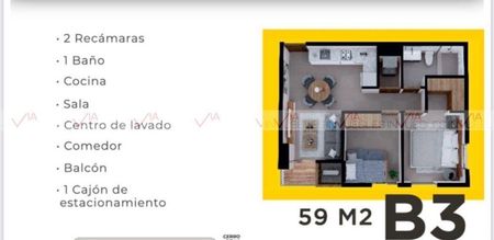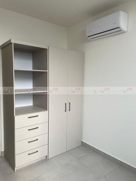 El departamento consta de sala, comedor y cocina en un concepto abierto, área de lavado, baño completo, recámara principal con vestidor y recámara secundaria con closet.