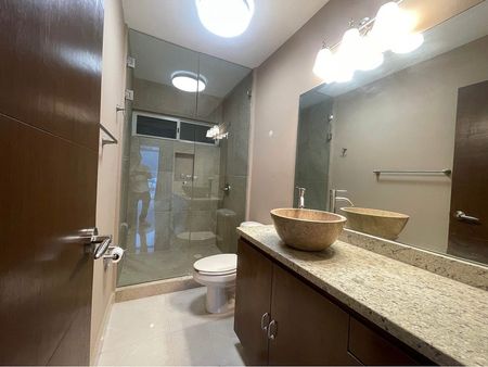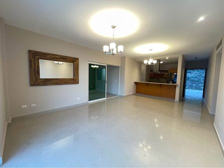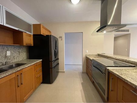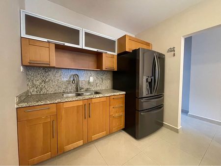 Cuenta con sala, comedor, cocina equipada con refrigerador, área de lavandería con lavadora y secadora con baño, estancia familiar con balcón,