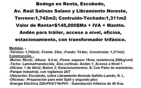 Se Renta Bodega Industrial, Terreno de 1,742 m2; Construcción 1,311 m2, Renta en $145,000, ubicada en Escobedo, sobre Libramiento Noreste, -Anden para tráiler: 1, -Acceso a nivel: 1, -Oficina de 40m2: 1, -Baños: 2, -Estacionamientos: 8, -Transformador trifásico de 45Kva, 220v/110v, -Patio maniobra, -Servicios, -Dentro de parque Industrial, -Seguridad 24/7. ML id 13272 / 14784
