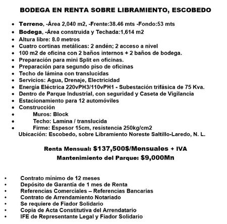 Bodega en Renta en Escobedo, sobre Av. Libramiento Noreste, Parque Industrial, Terreno: 2,040 m2; Construcción: 1,6140 m2; Oficina: 100 m2; Baños 4; Altura: 8 m Cortinas de acero: 4; Andén:2; Acceso a Nivel:2; Transformador de 75Kva; Estacionamiento 12; Servicios, Seguridad 24/7; Renta: $137,500 Mn + IVA; más mantenimiento de $9,000 Mn. ML id 13252 / 13208