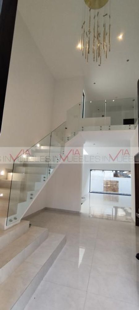 Cuenta con 2 niveles, en planta baja tiene cochera para 3 autos, recibidor con doble altura y hermoso candil, medio baño, sala, comedor, cocina de concepto abierto, lavandería, cuarto de servicio, terraza techada, alberca con cascada, medio baño en exterior, pasillo lateral, amplio patio y área social.