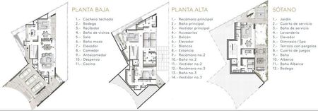 Recibidor, Baño de visitas, Elevador, Sala Comedor, Cocina con antecomedor, Baño de Mozo, Cochera Techada para 3 y Bodega.