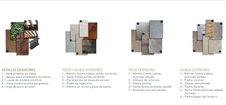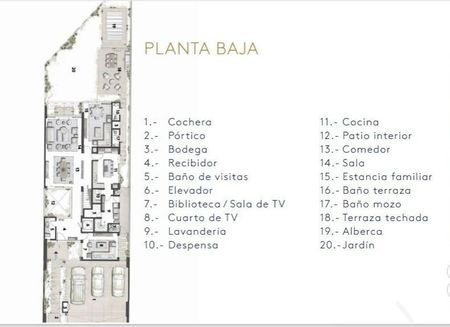 Recibidor, baño de visitas, elevador, biblioteca/sala de TV, sala comedor, cocina con antecomedor, terraza con medio baño, alberca, jardín, lavandería, baño para mozo, cochera techada para 3 y bodega.