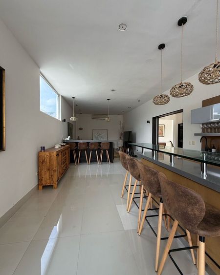 Sala comedor , cocina recién remodelada, terraza techada y jardin con pasto artificial, baño de visitas completo.