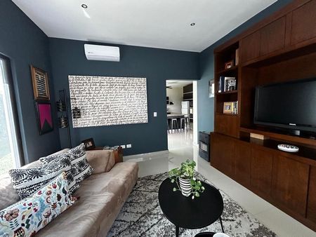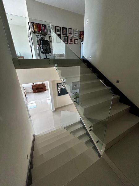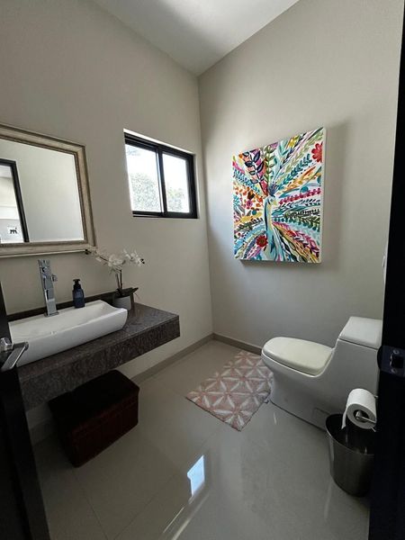 grueso en color negro, lavabos con cubierta de granito, minisplits en sala, estancia de TV y 2 recámaras, tinaco, bomba, boiler.