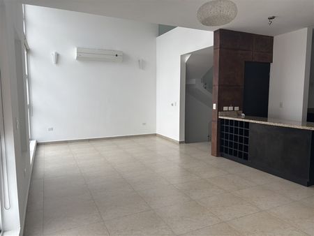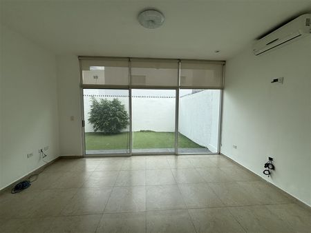 Primer planta se encuentra el área de sala y comedor con unos ventanales que brindan iluminación natural a toda esa planta y con doble altura en el área de la sala, cocina, lavandería y cochera techada para dos autos. En la segunda planta se encuentran tres recamaras cada una con su baño completo y la principal con amplio vestidor y un área de distribución entre las recamaras que puede utilizarse como oficina. En el sótano se encuentra una bodega, un área que puede utilizarse como un family room y el jardín. El cuarto de servicio también se encuentra en esta planta solo que tiene acceso por un pasillo de servicio. Todas las áreas de la casa cuentan con minisplit.
