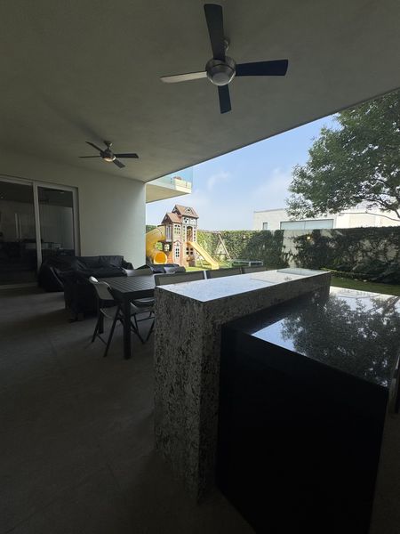 El cuarto de juego se conecta a la terraza, que viene con su barra, área de asador y medio baño. Las ventanas (Duovent) se abren completamente para poder disfrutar de todo el espacio.