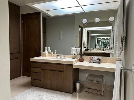 Planta Baja: Recibidor y medio baño. Sala y comedor en un mismo espacio, con acabados de madera en las paredes, plafón con luz indirecta y muebles empotrados de alta calidad.