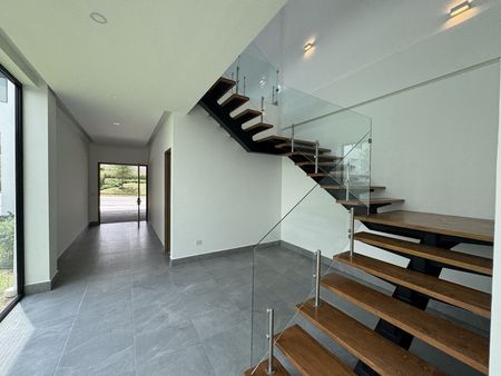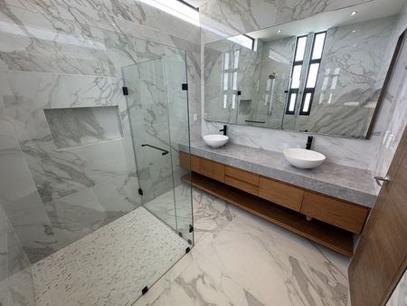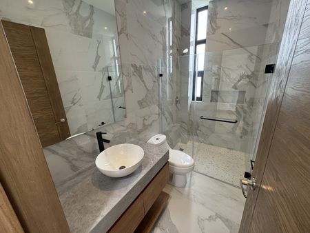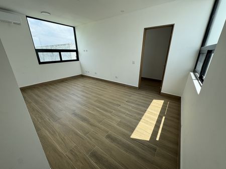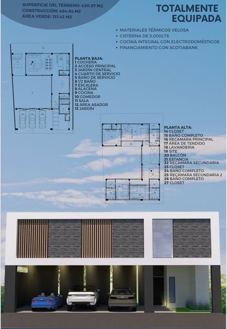En la planta alta se encuentran tres recámaras, cada una con baño y vestidor (la principal con doble lavabo y vestidor extra amplio), además de una estancia familiar y lavandería independiente. Se entrega totalmente equipada con 6 mini splits inverter frío/calor, canceles en baños, ventanas Duo Vent, duela LVT en recámaras, sistema de riego automatizado, cisterna de 5,000L, y preparación para paneles solares.