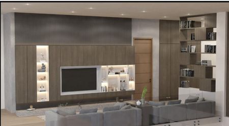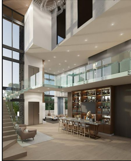 Acceso con recibidor y bar en doble altura, triple altura en escaleras a planta alta, cubo de elevador, Sala techada en doble altura, comedor con balcón sin techar, baño de visitas, cocina con family room y antecomedor, despensa, cuarto de lavado, pasillo