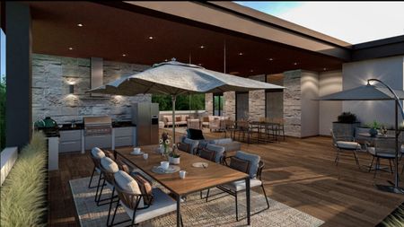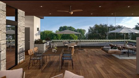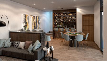 Área social exterior techada con barra de granito con preparación para refrigerador, tarja y asador, Sala de Juegos con área de bar, de cubo de elevador, bodega y baño completo, área social sin techar y área para equipos y paneles solares.