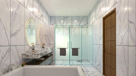 Recámara principal con balcón techado, baño completo con tina de hidromasaje y vestidor walk-in closet en dos niveles. Tres recámaras secundarias, todas con baño completo y vestidor walk-in closet, 2 con balcones, estancia/sala de TV, closet de blancos y sink, cubo de elevador y escalera a rooftop oculta.