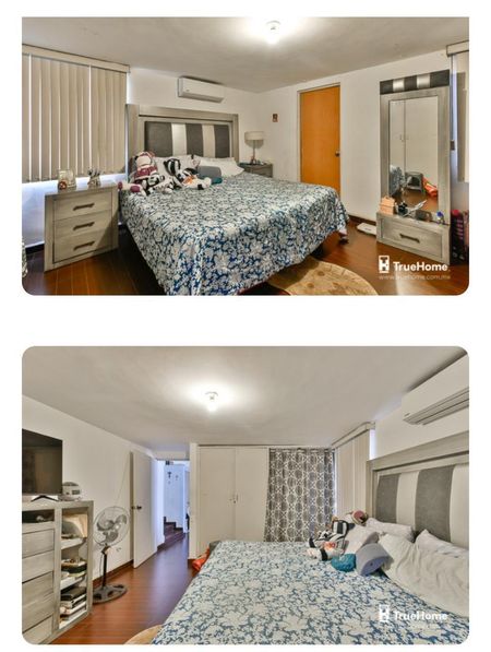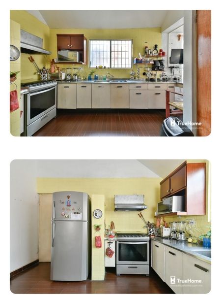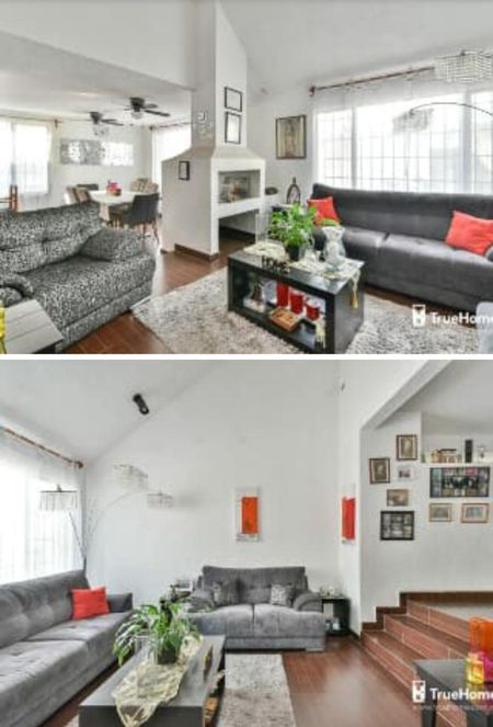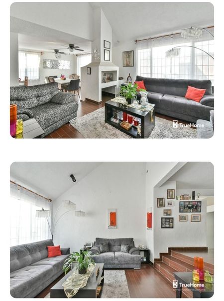 Son 2 terrenos, recibidor, cochera amplia, cocina, sala y comedor, chimenea, en planta baja 3 recamaras, la principal, con baño, otra comparten amplio patio, planta alta 1 recamara.