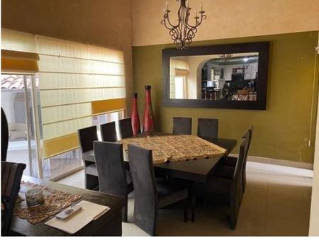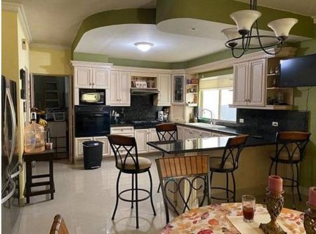 En Planta Baja cuenta con cochera para 3 autos con portón eléctrico, recibidor, sala - comedor con doble altura, cúpula de ladrillo rojo, cocina equipada con desayunador, cuarto de servicio con baño completo, patio con asador