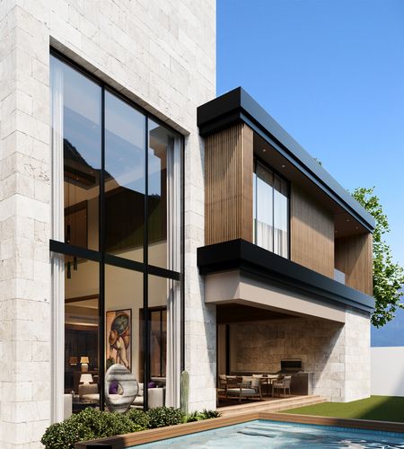 comunes, y Piso porcelanato de gran formato de 60x120, 60x90 y 19x59 cm en recámaras, baños, vestidores y exteriores.