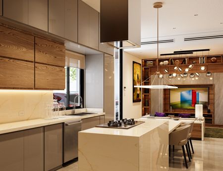 Cocina integral con isla y cubierta de cuarzo, despensa y puertas semisólidas con marco de 17 cm.
