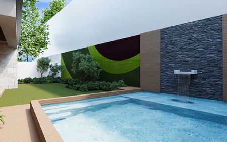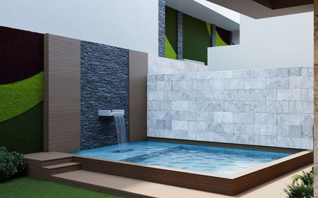 Alberca de concreto armado, impermeabilizada, con azulejo veneciano, bomba y filtro.
