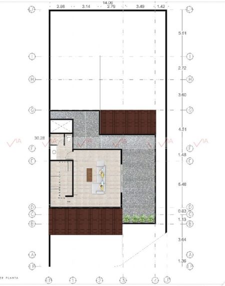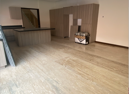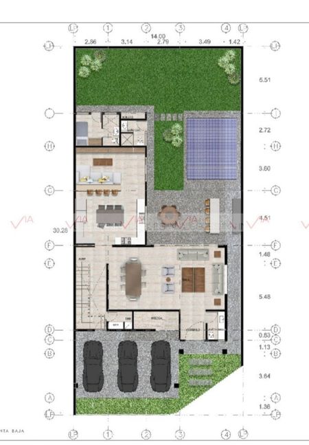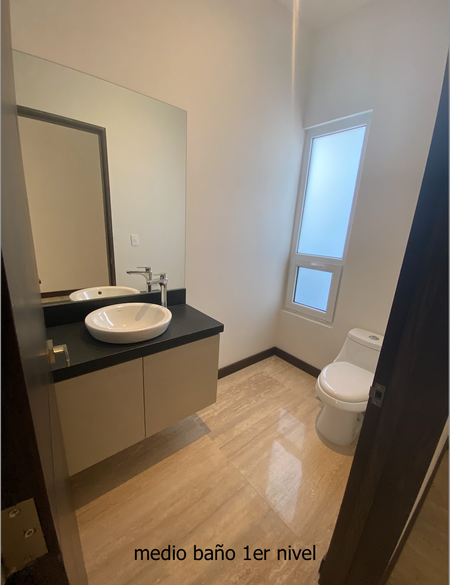 Cochera para 3 autos con 3 accesos (por cochera, principal y pasillo lateral) y bodega, Medio baño (visitas), Recibidor, Sala, Cuarto de Site, Cocina con puerta corrediza que divide el area social, equipada con muebles empotrados, barra al centro con desayunador, revestido de granito y muy amplio espacio para antecomedor o sala adicional con vistas y salida al jardin.