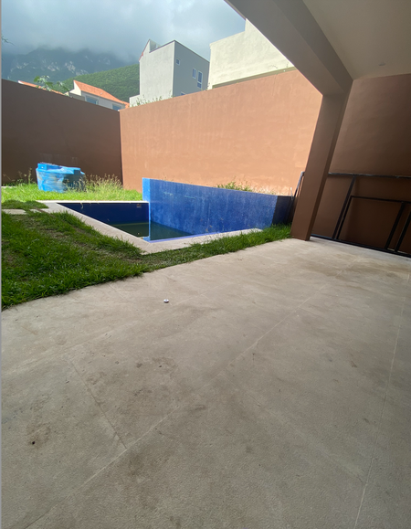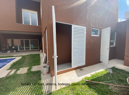 Terraza techada amplia, Alberca, medio baño, bodega, cuarto de servicio con baño completo, bodega para equipo de bombas y jardín