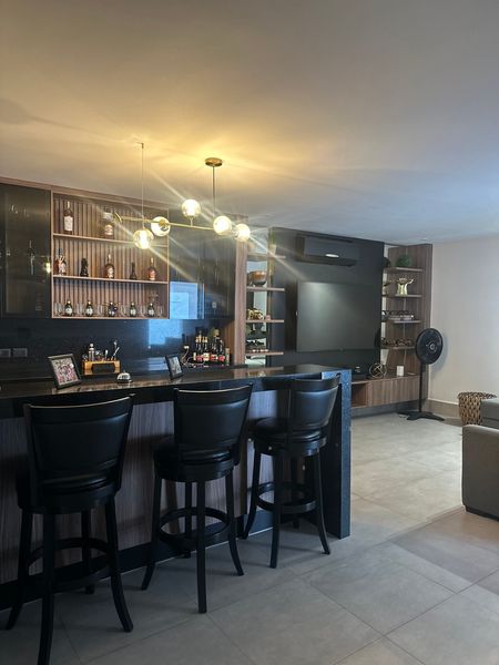 Cuarto de cine con butacas amplio bar con familia Room sala y comedor.