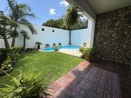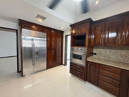 Casa en venta en una de las mejojres zonas de Palo Blanco. En PB cuebta con cochera para 2 autos con portón electrico, recibidor, sala comedor con hermosa vista al jardín con alberca y terraza. Tambien baño de visitas, cocina con cubierta de granito y a un lado de la cocina lavanderia equipada co lavadora y secadora y antecomedor con salida al jardin. Cuarto de servicio y bodega amplia bajo la escalera.