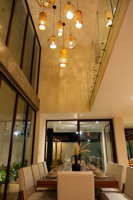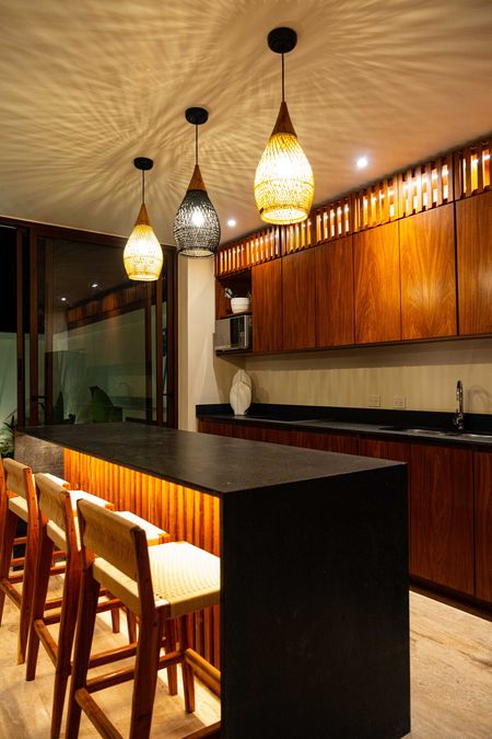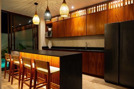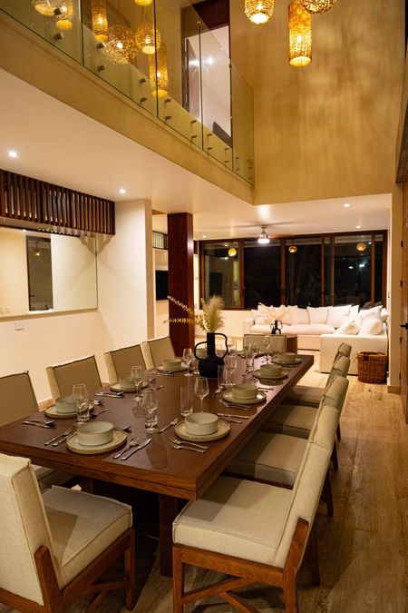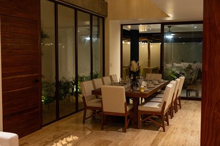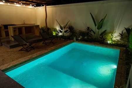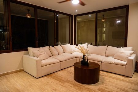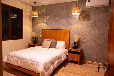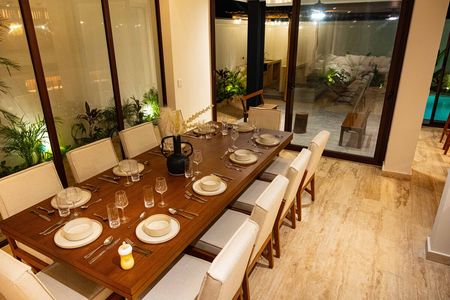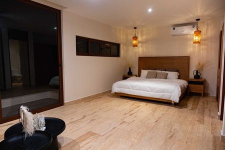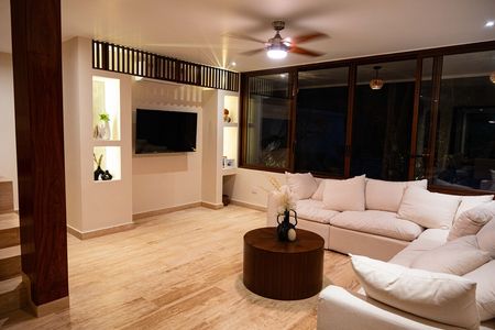 La primera planta cuenta con su sala de estar con TV de 50 pulgadas y su 1/2 baño de visitas. También con su comedor de doble altura, cocina completa con su barra, cuarto de servicio y su roof-garden con alberca privada y área de asador con su barra tambén. La segunda planta cuenta con la recámara principal, la cual tiene su propia terraza exterior, su baño completo con su "walk-in closet", su recámara king size y un ventanal con vista interior al roof-garden. Así mismo, la segunda planta cuenta con otro baño completo independiente y otras dos recámaras con 1 clóset cada una y camas tamaño queen size. En la tercera planta se puede apreciar la máster bedroom, con su amplia recámara king size, 1 clóset, área para ver TV con un sofa-cama y su mesa de centro. Afuera de ésta, se encuentra el rooftop, con su amplia área social con banca una de concreto y sus barras para que se pueda aprovechar de la mejor manera posible dicha área. También cuenta con baño completo esta planta.