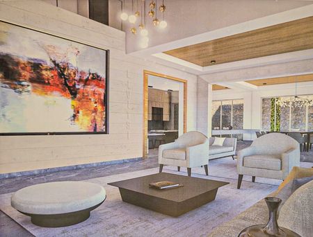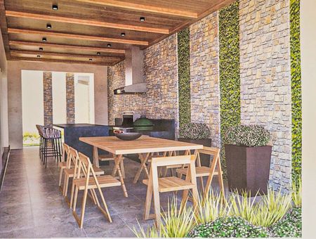 Primer nivel: recibidor, medio baño, elevador, sala con techo doble altura, comedor,family room, cocina con cubierta de piedra natural equipada con electrodomésticos, lavandería. Terraza con muebles y asador a la medida con campana y puertas, todo en acero inoxidable, rodeado de barras según diseño arquitectónico, forradas en granito a su elección. Alberca (2.8 X 7 mts. plano anexo) cubierta de azulejo veneciano, equipada con bomba, filtro, foco, boquillas,desnatador, llenado y dren de fondo y escalón de acceso.