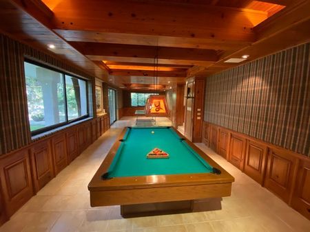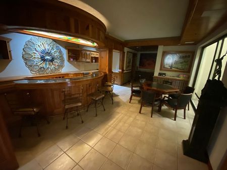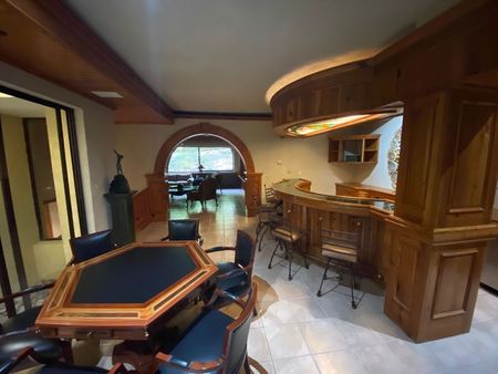 La casa consta de 3 plantas, 3 recámaras, cuarto de juegos, cuarto de alberca con baños exteriores, doble sala, cochera para 4 techada más rotonda para invitados con capacidad para unos 10 autos más. La casa tiene un hermoso jardín muy amplio, con terrazas y alberca.