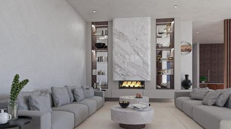 Mármol en áreas sociales de la casa , porcelanato en recámaras . Zoclo remetido con perfil de aluminio .