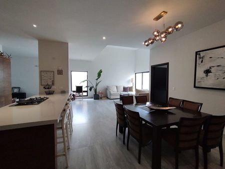 Área de Sala , comedor , cocina concepto abierto y cubierta de Cuarzo, parrilla , horno . Alacena amplia