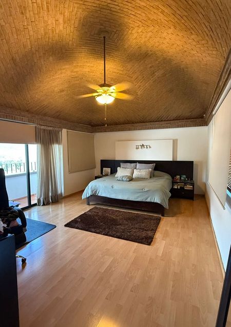 Segunda planta: Distribuidor con baño completo que lo comparten las dos recámaras secundarias, cada una con clóset de pared. La recámara principal cuenta con una sala de TV, vestidor y baño completo.