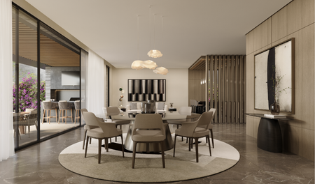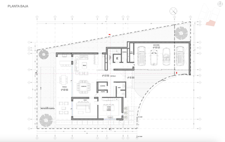 Planta Baja: Cochera, area social con sala y comedor sumamente amplio, terraza techada con área de asador, jardín, y un estudio. Sala de tele con antecomedor, area de cocina cerrada y bar y un medio baño.