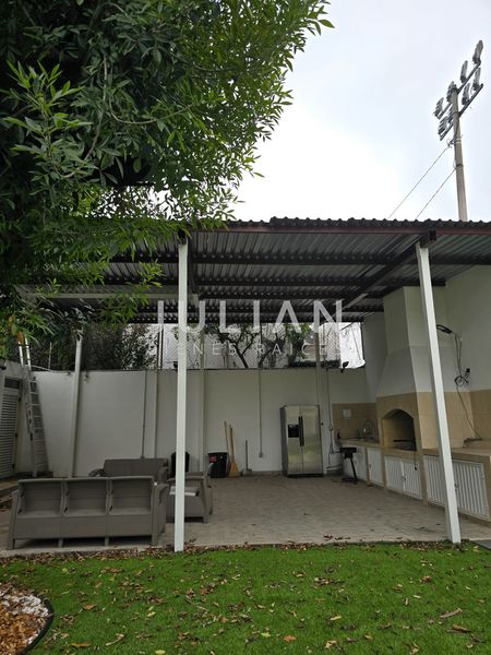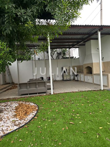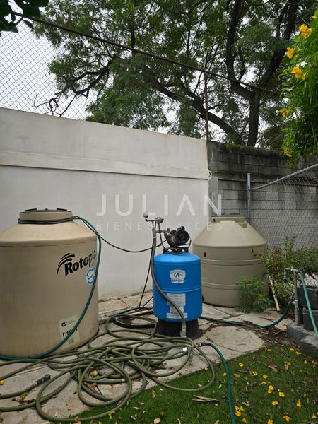 Porton 2 puertas para 3 carros, recibidor - lobby, de lado izquierdo encontramos un area de sala y comedor que conecta con el amplio jardin con alberca, de lado derecho se encuentra la amplia cocina equipada con estufa, refrigerador, microondas y horno, con su alacena independiente en un cuarto, en otro cuarto se encuentra el desayunador, el cual conecta con un patio interno de la casa.