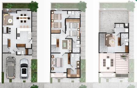 3 recámaras la principal con baño vestidor y balcón, Vestíbulo, Sala - Comedor, Cocina, Sink, Doble estancia, Lavandería techada, Terraza techada y pérgola, Azotea de servicio y Cochera doble semi-techada.