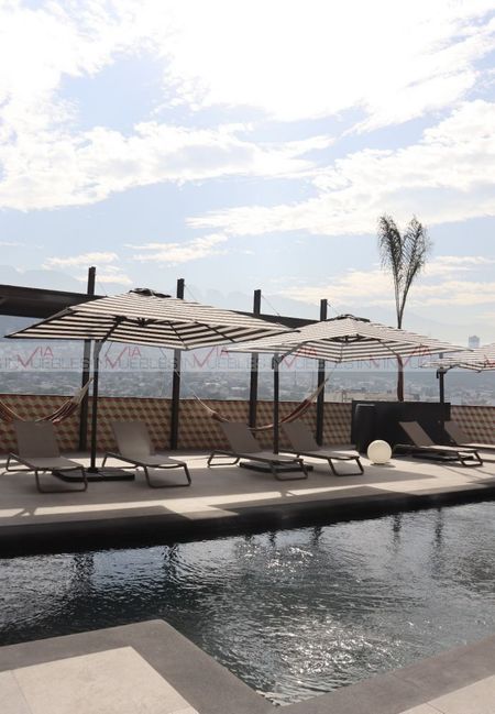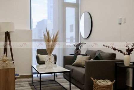 Bonito departamento en renta en torre nueva en el centro de Monterrey, excelente ubicación por su acceso inmediato a importantes avenidas, el departamento cuenta con dos recámaras, área social, balcón, cocina equipada con refrigerador, estufa, campana, horno microondas. La torre cuenta con una amplia terraza con asadores, además de alberca, gimnasio bien equipado, sala Lounge, área de co-work con privados. Seguridad 24/7. Cajones de estacionamiento disponibles. "el departamento no incluye muebles" Id Gvia: 112047
