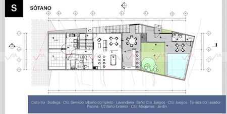 sótano: cisterna, bodega, cuarto de servicio c/baño completo, lavandería, cuarto de juegos con baño completo, terraza con asador, piscina,1/2 baño exterior, cuarto de máquinas, jardín.