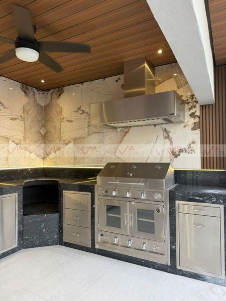 Planta Baja: cochera techada para 2 autos, sala de doble altura, comedor con vista al jardín y alberca, sala de TV, cocina equipada, lavandería, cuarto de servicio con baño, medio baño social y área de asador con medio baño.