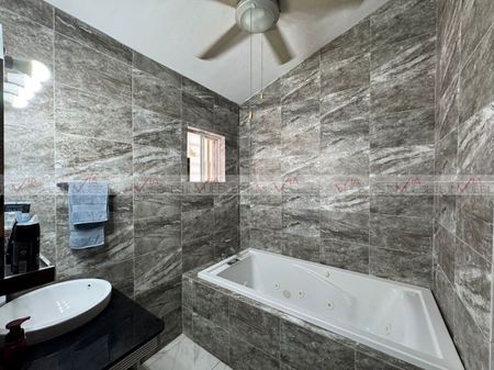 Además, cuenta con jacuzzi con hidromasaje, sistema de cámaras de seguridad, abanicos y candiles, alberca, jardín, minisplit, teléfono, calefacción, boiler, A/C, gas, luz, agua, cocina equipada, portón eléctrico, cisterna y área de asadores.