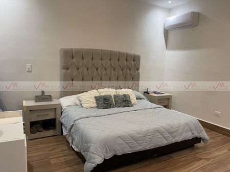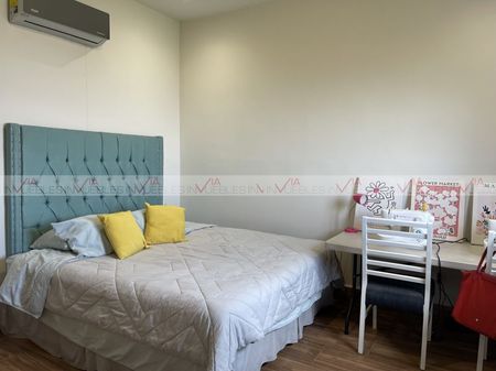 En la planta baja se localiza una cuarta recámara con un moderno closet de pared y escritorio, y cuenta con baño completo. Dicha recámara tiene acceso a través de una puerta corrediza a un patio con jardín sintético, en donde se pueden colocar un asador y una sala lounge.