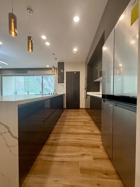 Cocina equipada con refrigerador y horno empotrado, amplia despensa, área de sala con centro de entrenamiento, comedor y balcón con vista a