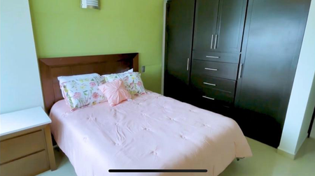 El departamento se encuentra completamente amueblado y equipado de 160mts. cuenta con 3 recámaras cada una con baño y closet, baño de visitas,sala comedor, cocina completamente equipada con electrodomésticos, vajilla,cuchilleria, cuarto de servicio con lavadora y secadora,. 2 cajones de estacionamiento