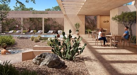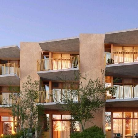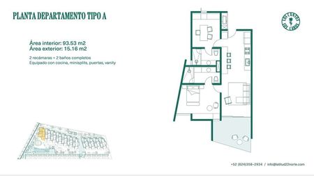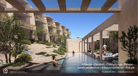 Proyecto arquitectónico diseñado por Landa + Martínez Arquitectos es un desarrollo de 33 departamentos, estacionamiento techado, alberca y palapa.