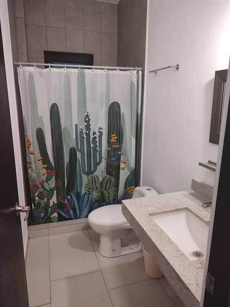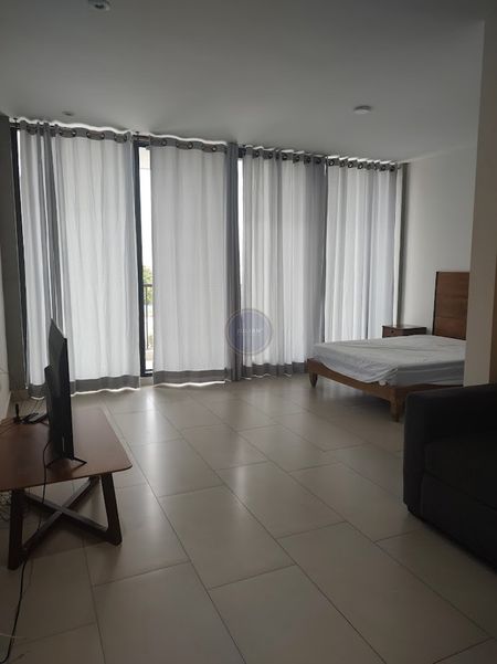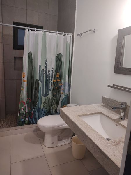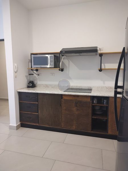 Cuenta con cocina integral con estufa, campana, refrigerador y microondas, comedor para 4 personas, área social con sala y mueble con TV Recámara con cama matrimonial, walk in closet, Baño completo