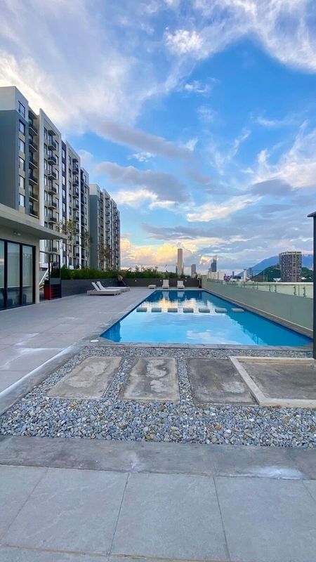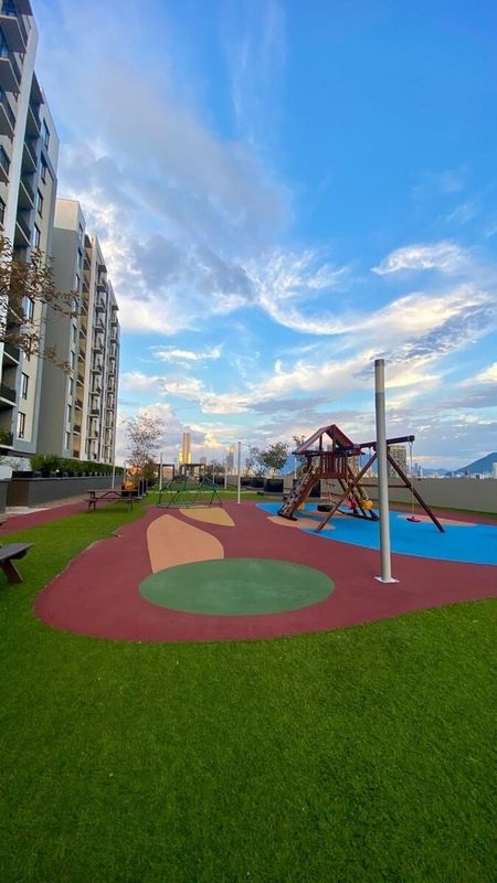 Cuenta con sala, comedor, cocina equipada con microondas, estufa, campana, refrigerador y placa de granito; 2 recámaras, 2 baños completos y 1 medio baño, la recámara principal con walk in closet y balcón con vistas a la sierra madre y al cerro de la silla; lavandería, bodega, 2 cajones de estacionamiento a un lado del elevador.