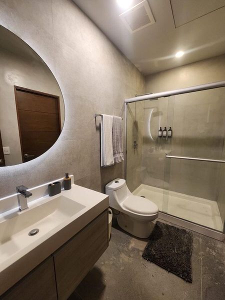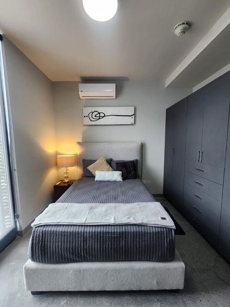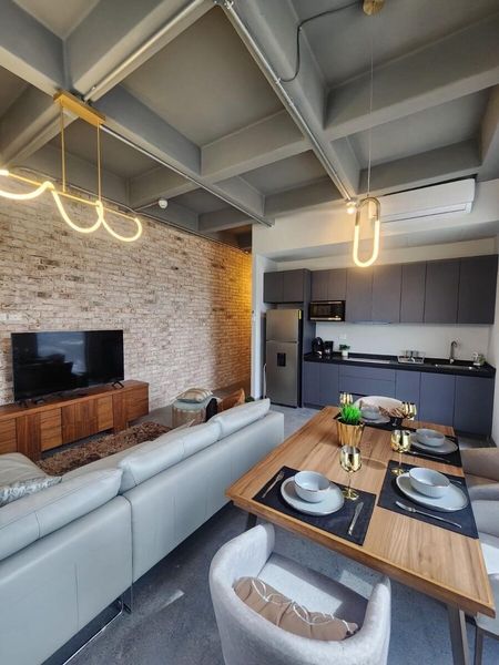 Su cocina, práctica y elegante, está equipada con refrigerador, parrilla eléctrica, campana, microondas, cafetera, licuadora y máquina Dolce Gusto, además de vajilla completa, utensilios, sartenes, vasos y juego de cuchillos. EL departamento está equipado con minisplits para lograr un espacio confortable. La sala, decorada con un estilo moderno, incluye un cómodo sofá y televisión; listo para disfrutar desde el primer día. También encontrarás ropa de cama y juego de toallas, para que no tengas que preocuparte por nada más que instalarte.