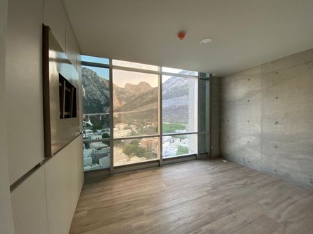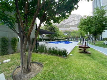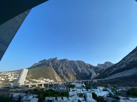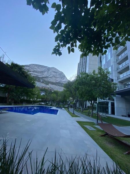 Hermoso departamento con vistas increíbles a la huasteca, tres recamaras, amplio balcón con vista privilegiada, nueva distribución con despensa y lavandería aparte, bodega grande, dos estacionamientos, equipado, lavadora, secadora, persianas, despensa, muebles empotrados de diseñador, equipo de cocina de alto lujo, mini splits inverter, modernos acabados de granito, amenidades como alberca, asadores, sala de eventos, biblioteca, áreas de juegos, jardines, área de gym, área de bar. Piso alto