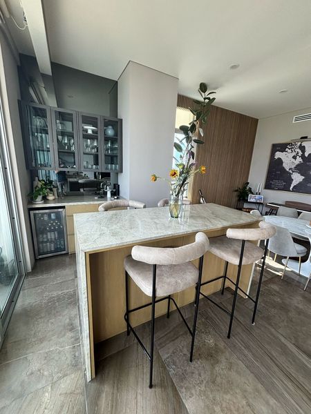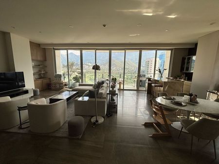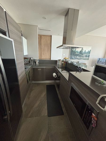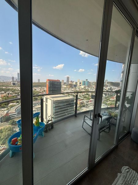 El departamento tiene una excelente distribución con una amplia sala con bar, cocina abierta equipada, una increíble terraza y vistas panorámicas impresionantes a la Sierra Madre y al Club Campestre Monterrey.