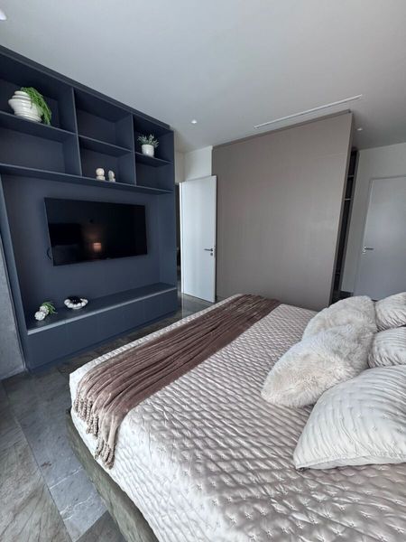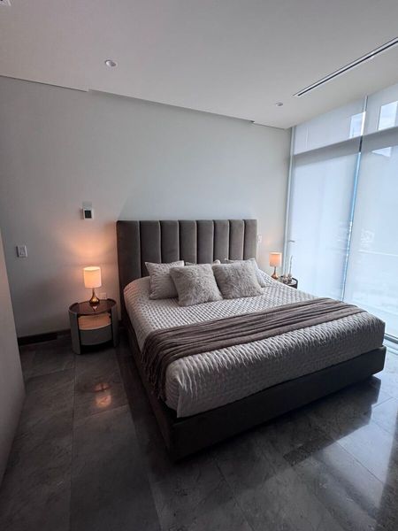 Equipado: cocina con parrilla, campana, horno y refrigerador. Climas, unidad de lavaseca, boiler. Comedor de 4 sillas, sala, mueble de TV, cama king size.